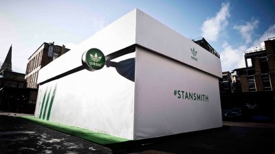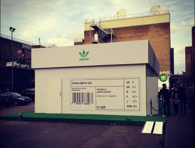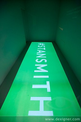 C’est Stan Smith. Ce joueur effigie du modèle phare d’Adidas. Le modèle le plus vendu avec 40 millions de paires depuis 50 ans. C’est pour cela que tout se passe dans la boite. Pour les Adidas Stan Smith, ça se passera dans une boite à chaussures. Je vous rassure. Adidas n’a pas vu les choses en petit. La boite qui fait 13,50 x 7,50 mètres (+ de 100 mètres carrés) avait de quoi accueillir.
