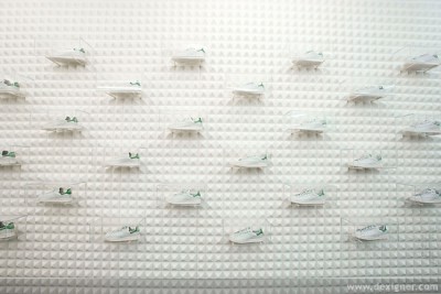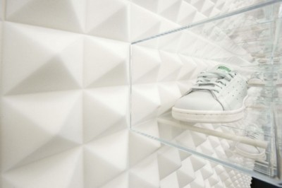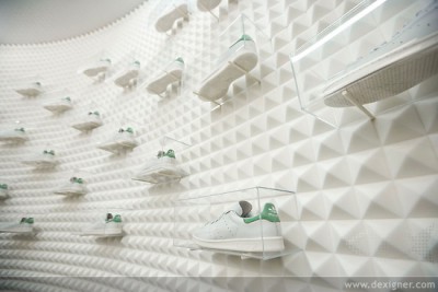 Et là, vous découvrez un mur majestueux sur lequel sont fixés 120 boites translucides présentant 120 Stan Smith. J’aurai opté pour un choix de couleur qui fasse plus ressortir le produit star !